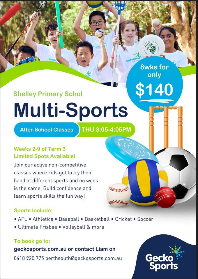 Gecko Sports welcomes all ALL KIDS aged 5-12 years old to come and join the fun with our experienced, enthusiastic kids coaches and sports specialists. Please click on the link below for more information: Enrolmy | GeckoSports Perth South – Booking Calendar for GECKOSKILLS After School Club PP – Year 6: Shelley Primary School Term 3